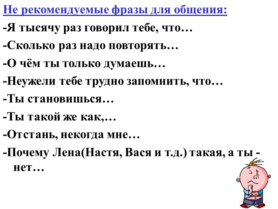 Каждый человек может испытать негативные эмоции, и это нормально. Не нужно говорить малышу: «Ты плохой, такой мальчик мне не нужен» или что-нибудь подобное. Ни в коем случае не обвиняйте сына или дочь, не повышайте голос, а спокойно разберитесь с ситуацией