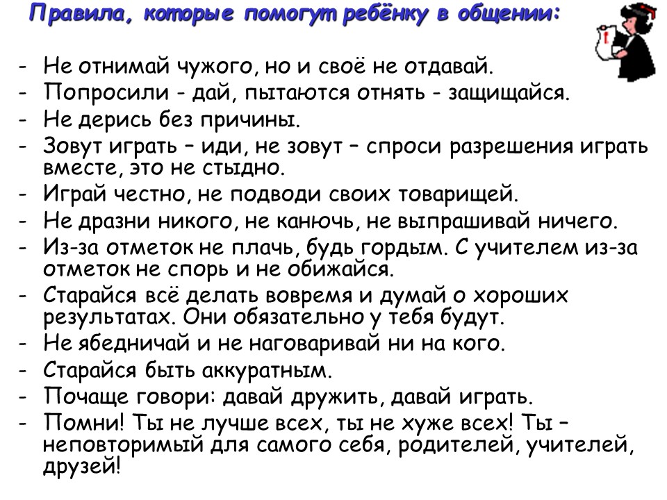 Психологи предупреждают родителей, что детям нужно рассказывать о возможных проявлениях агрессии и недовольства со стороны окружающих. На жизненном пути иногда попадаются бессердечные, алчные, злые люди, и задача ребенка – защитить личные границы, отстоять свое мнение, не прибегая к физической силе.