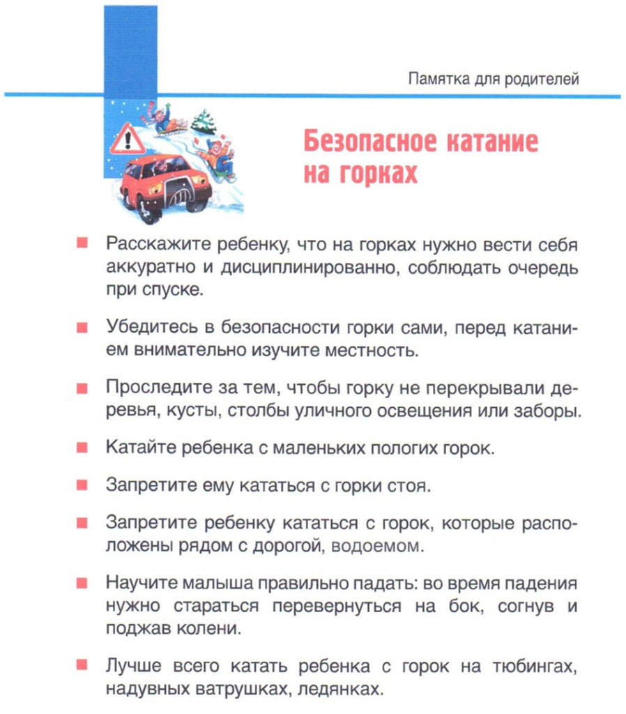 Запретите ребенку кататься с горок, которые расположены рядом с дорогой, водоёмом.