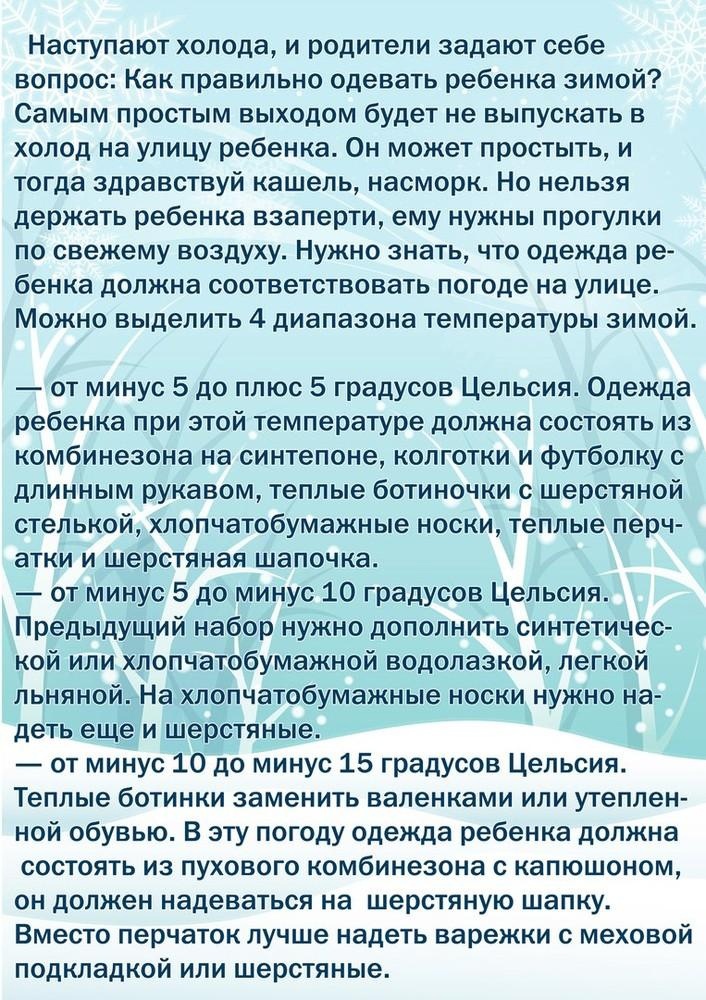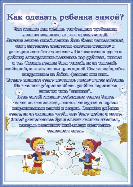 Зима – живописное и сказочное время года. Но когда в декабре срывается первый снежок, а все вокруг начинают готовиться к Новому Году, перед родителями ребенка дошкольного возраста возникает проблема, как правильно одевать малыша зимой. Ведь и переохлаждение, и перегрев одинаково опасны для здоровья крохи.
